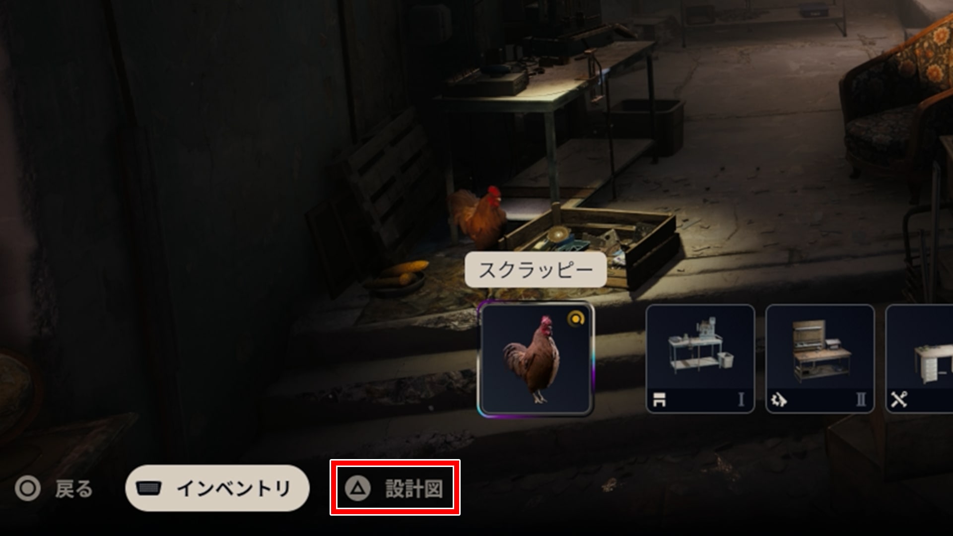 インベントリにある使いたい設計図にカーソルを合わせて「△ボタン」でメニューを開く。