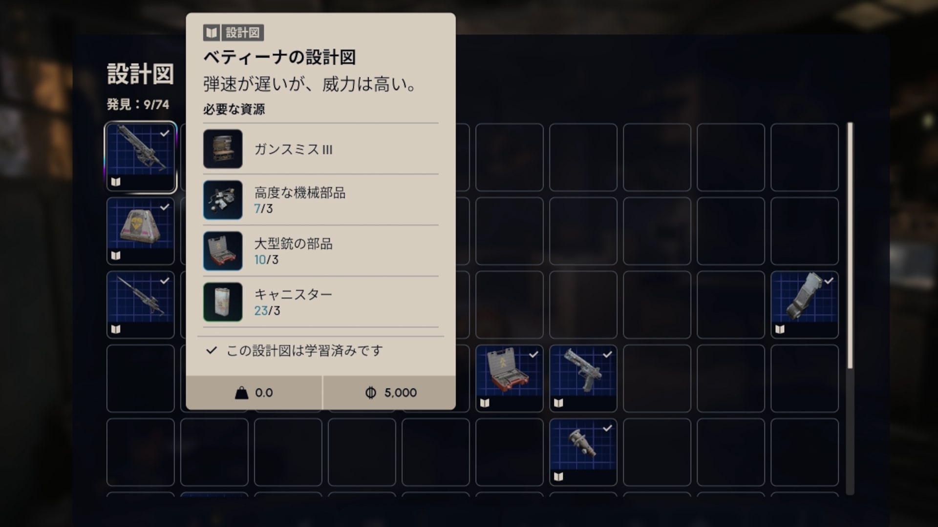 作成できるようになっているアイテムは、設計図の説明欄の下部に「この設計図は学習済みです」と記載されます。