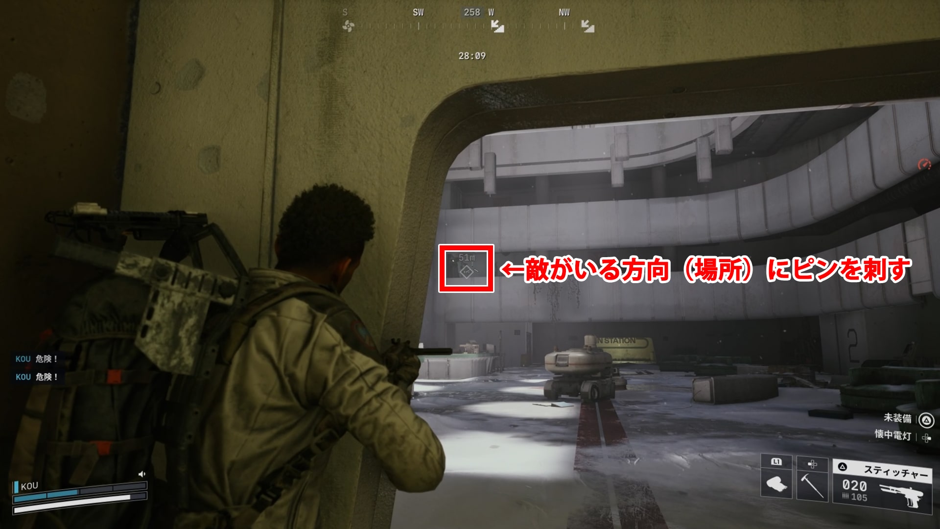 敵がいる場所にピンを刺すと、それを察知した近くにいる他のプレイヤーが助けに来てくれる場合があり、難を逃れることができるかもしれません。