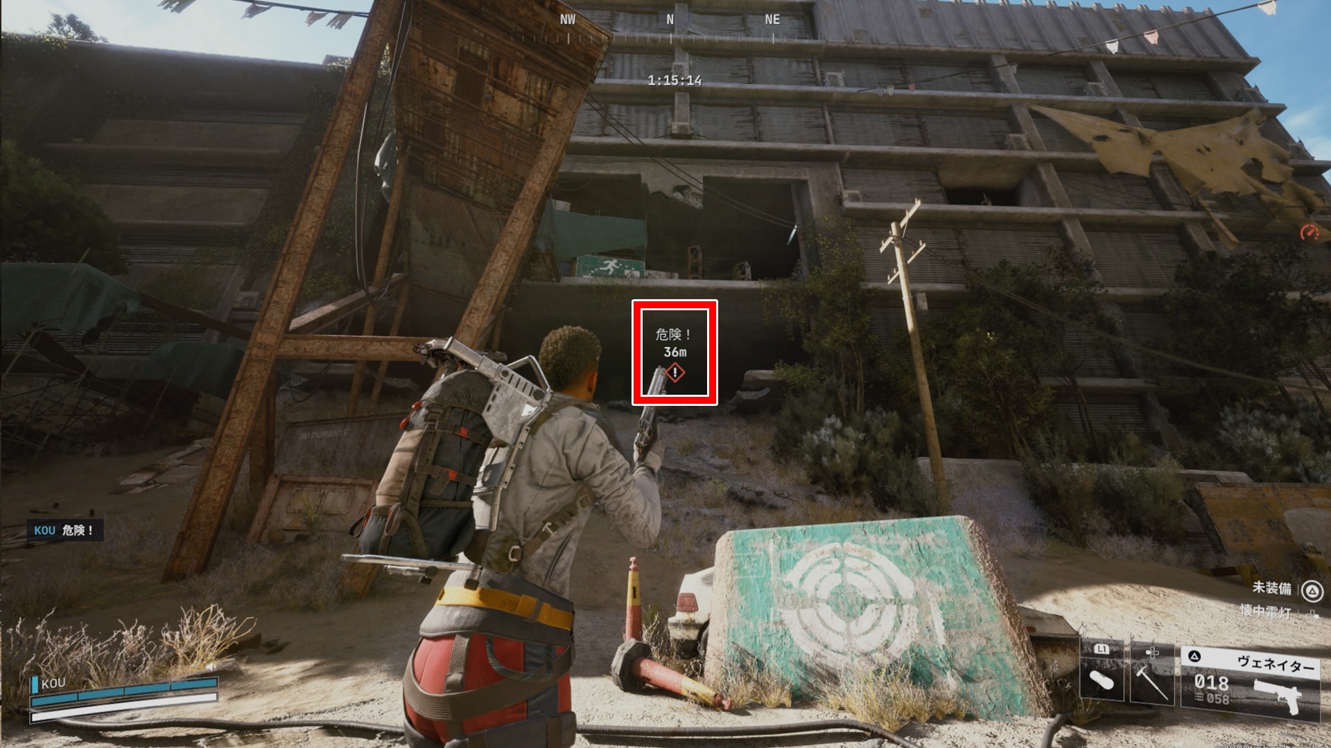画面中央の小さいドットを対象に向けて、「R1をダブルタップ(R1を2回押し)」すると、ピン刺しした地点に「危険!」と表示され、周囲に認知させられます。