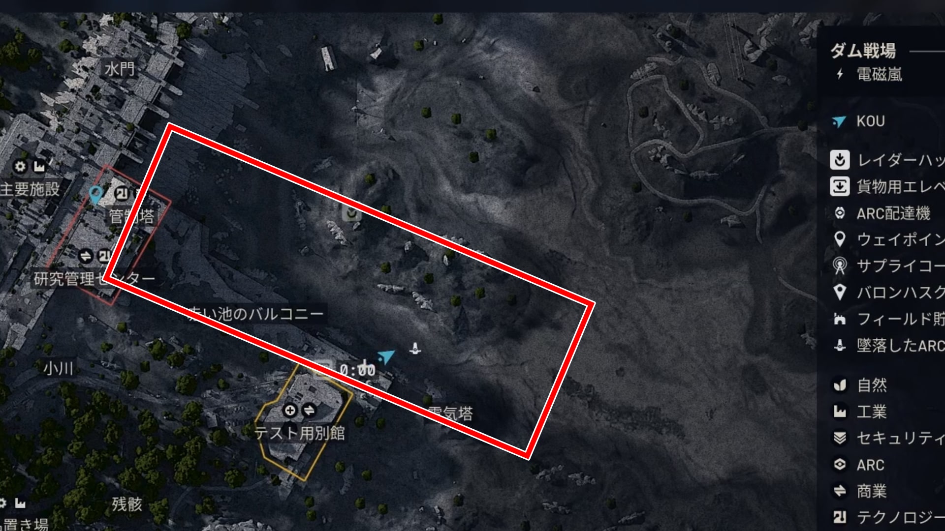 ロケッティアの残骸もこの辺りに多く、ARC配達機もこの辺にあったりするので、偵察機のボックスなど色んなレア素材を一度に多く入手できます。