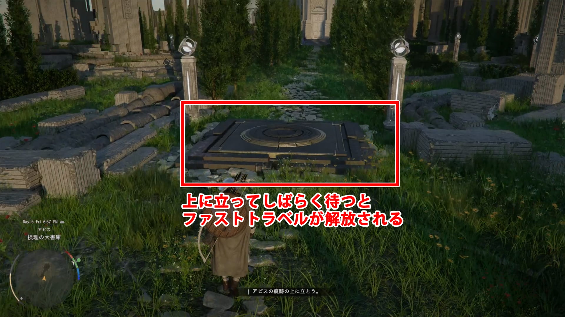 転送後、目の前にアビスの痕跡があるので、この上に立ってしばらく待つと、ファストトラベルが解放されます。