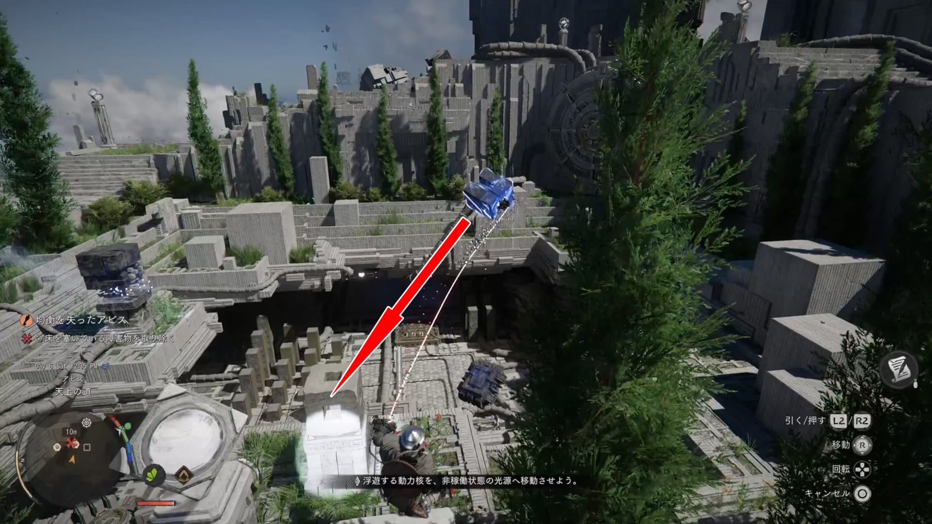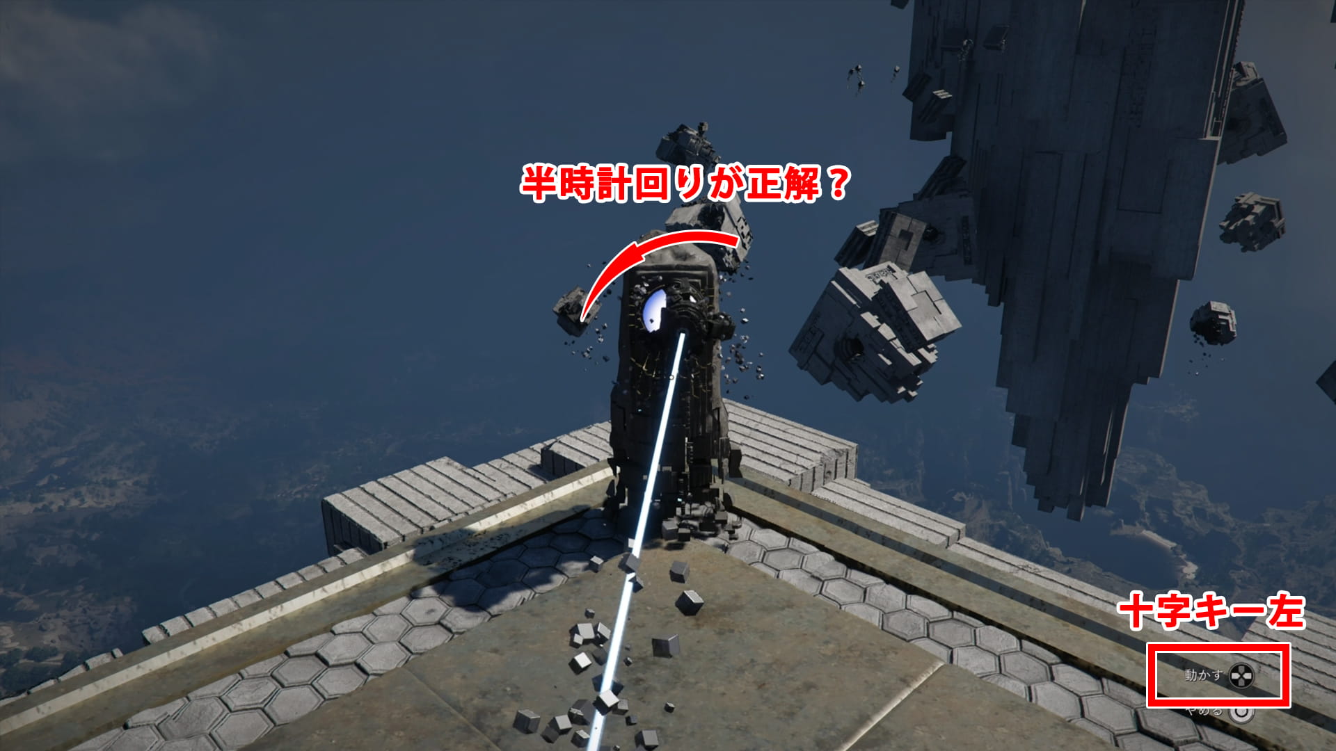 浮いている青いブロックを、光が差している台座まで摂理の力で移動させます。