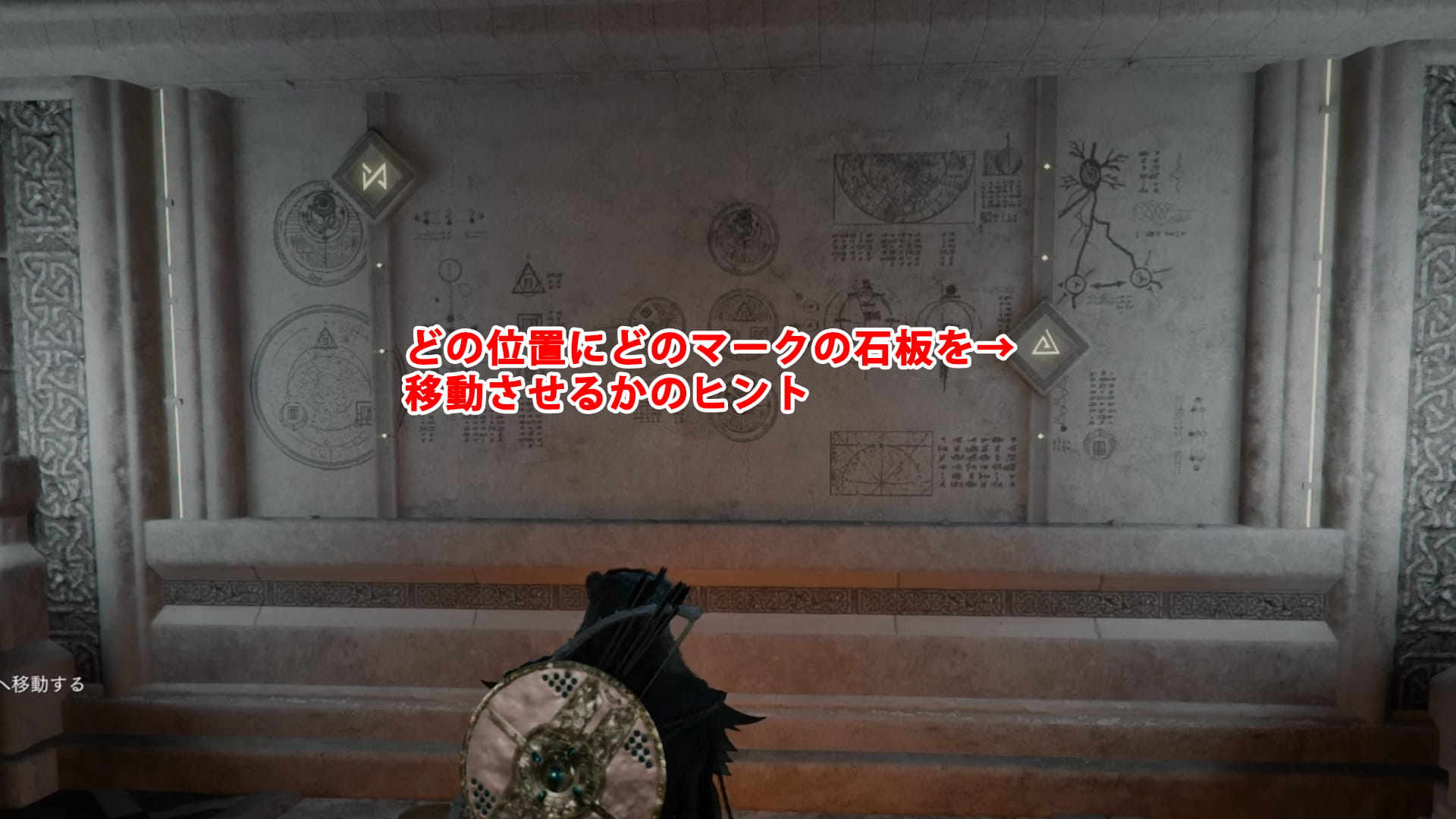 壁画に描かれた模様の石板を、適切な高さに移動させる必要があります。