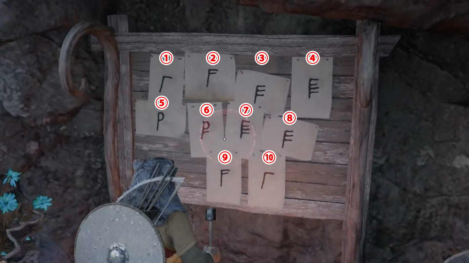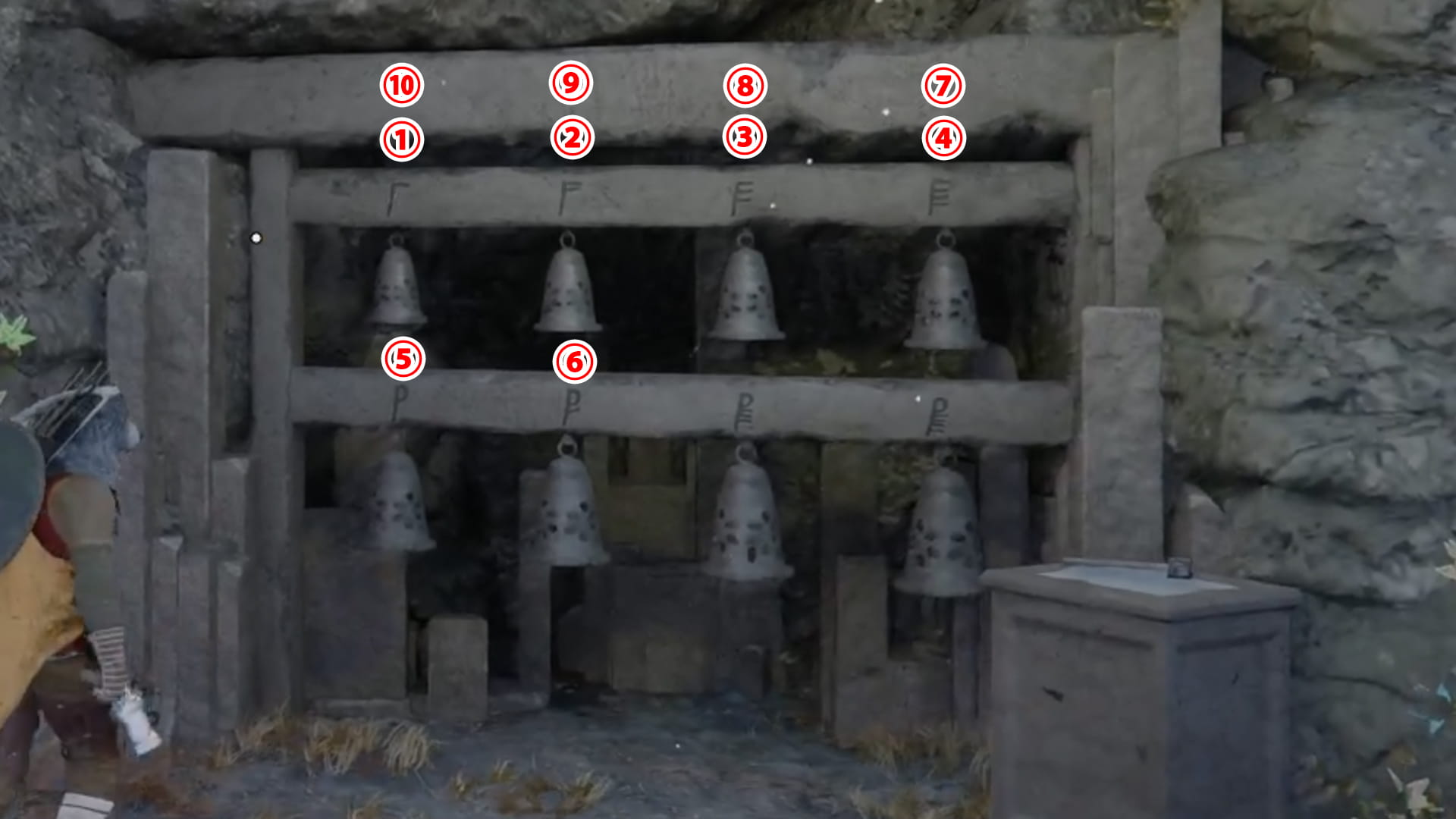 掲示板に貼ってある紙のマークを確認し、左上から順番にそれに該当する鐘を鳴らしていくだけになります。
