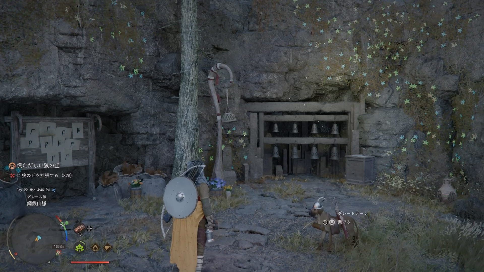 作業用ハンマーを装備し、鐘に「L1」で注視して「R1」で叩きましょう。
