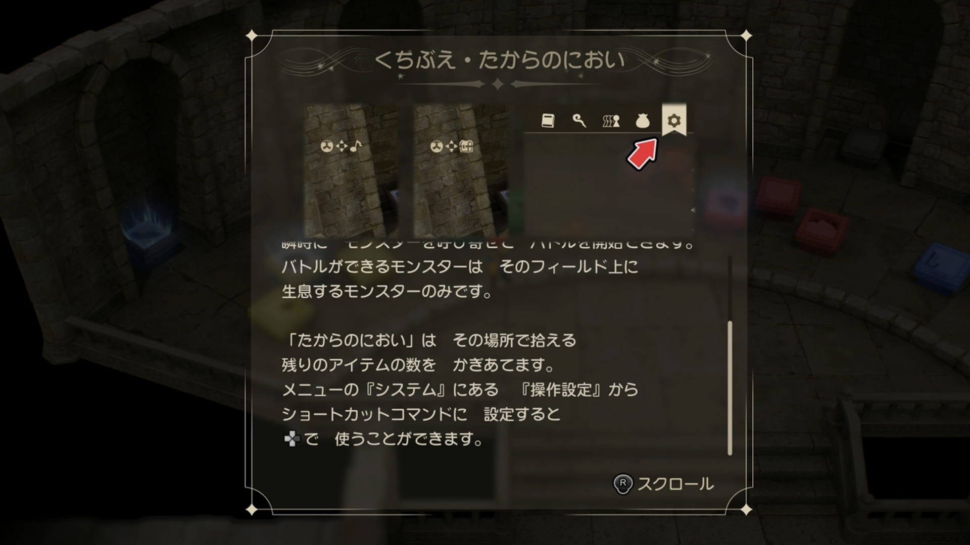 「たからのにおい」は、過去のドラクエシリーズにおける「とうぞくのはな」と同様のスキルとなり、今いる場所のアイテムの数が分かる、かなり有能なスキルになります。