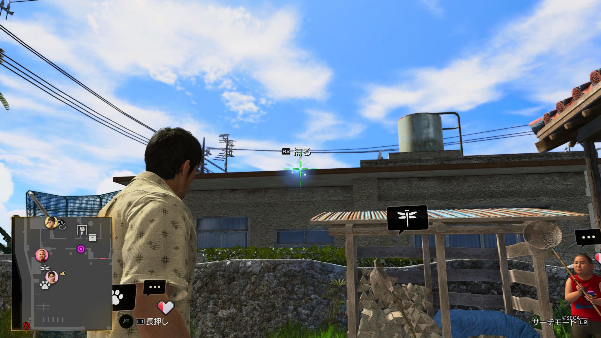 「L2」ボタンのサーチモード中に「R2」ボタンを押すことによって、虫を捕まえることができます。