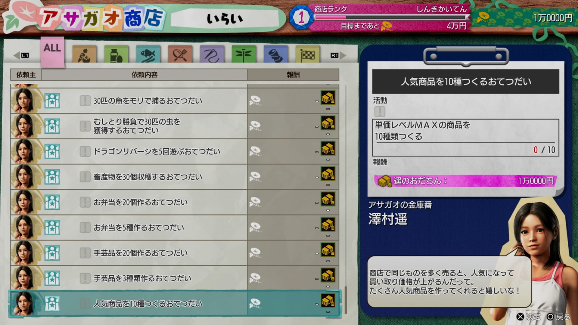 アサガオ商店で遥の依頼を達成すると、おだちんとして1万円以上もらうことができます。