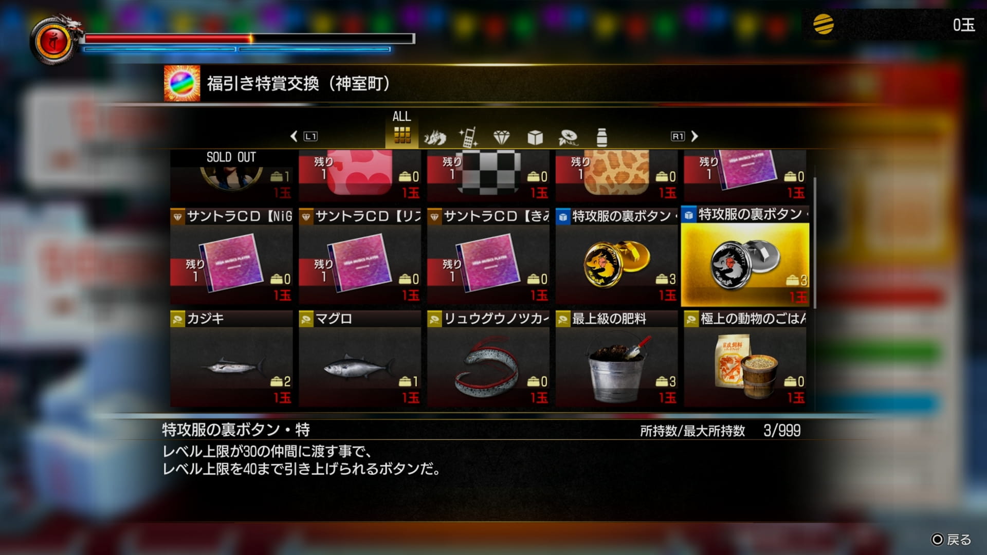 ただし特攻服の裏ボタンは色んな場所で入手できるので、レベル上限40まではそれほど苦労することなく誰でも上げられると思います。