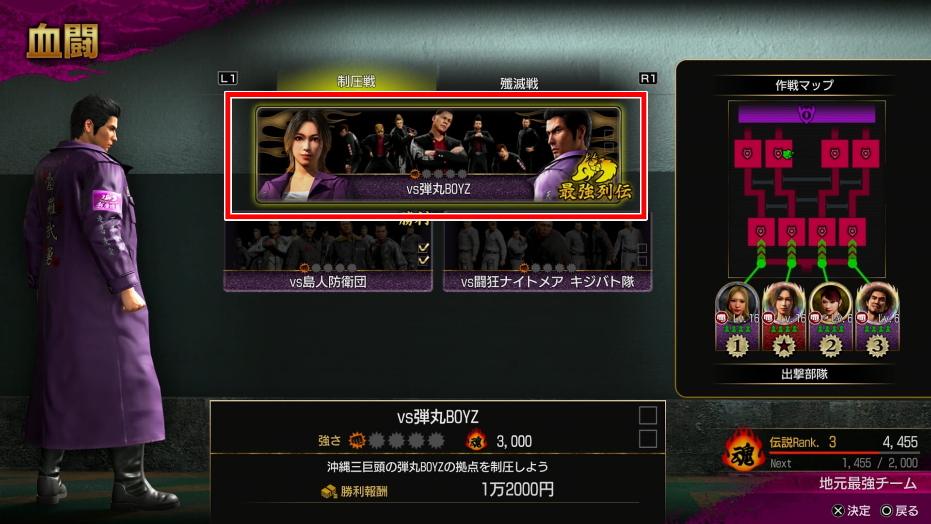 血闘の中の「制圧戦」か「殲滅戦」どちらかで「最強列伝」のアイコンが付いたバトルがあるので、それをクリアしていくことによってストーリーが進んでいきます。