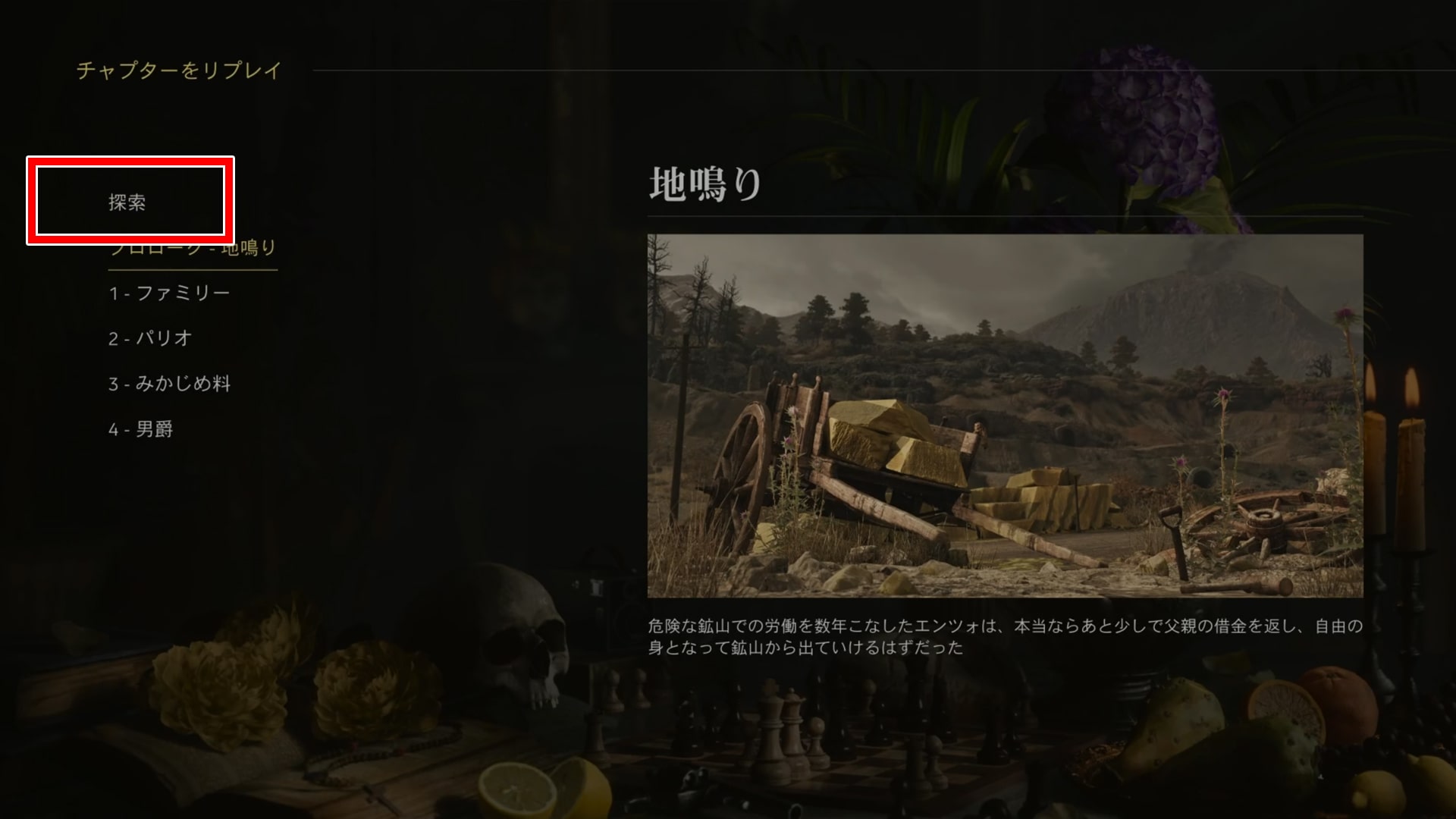 メインメニューの「チャプターをリプレイ」から探索モードに入ることができます。