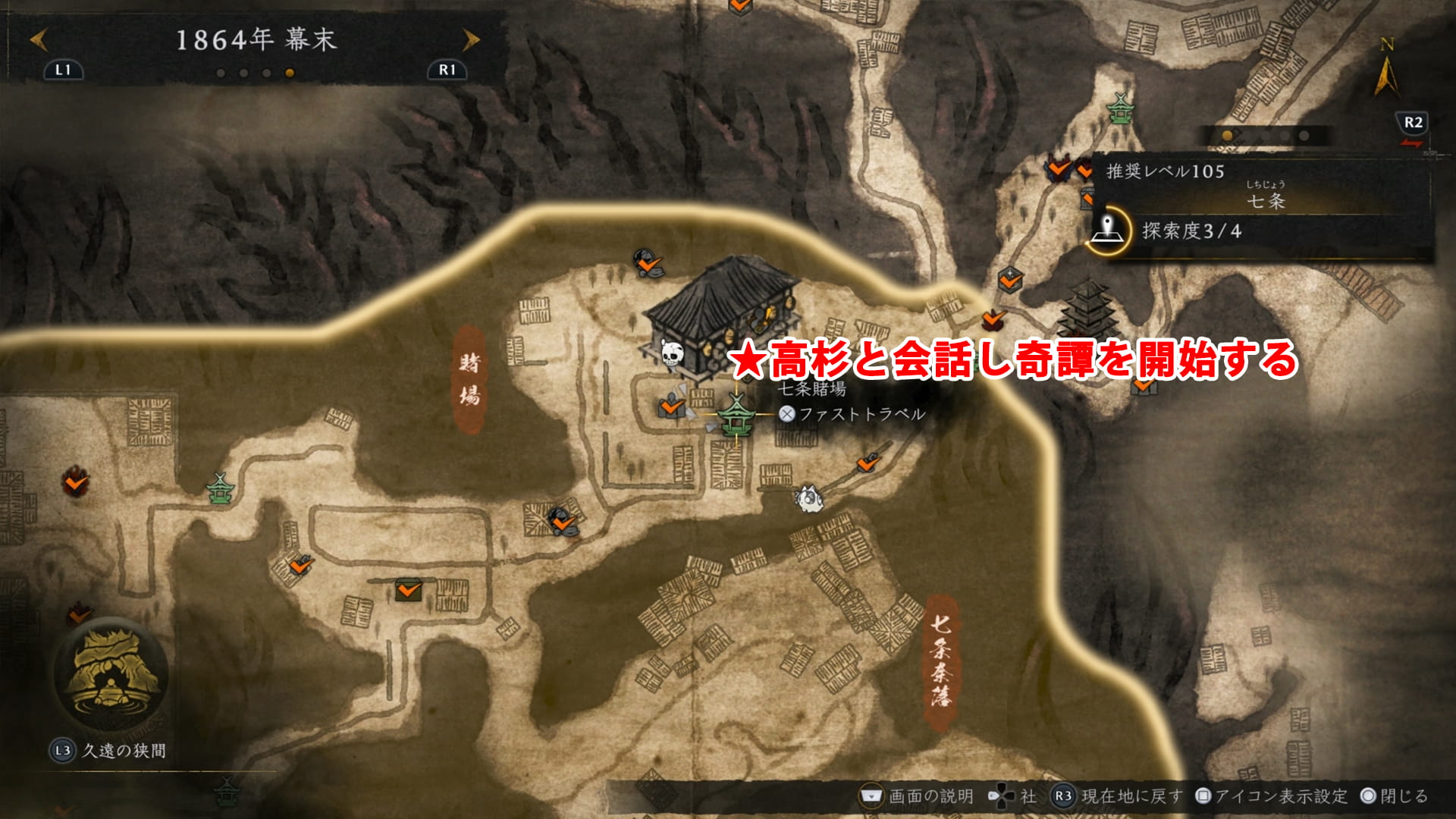 鍵を入手するには、七条の賭場の前にいる高杉と会話をし、奇譚「無二の刀」を受注しクリアする必要があります。