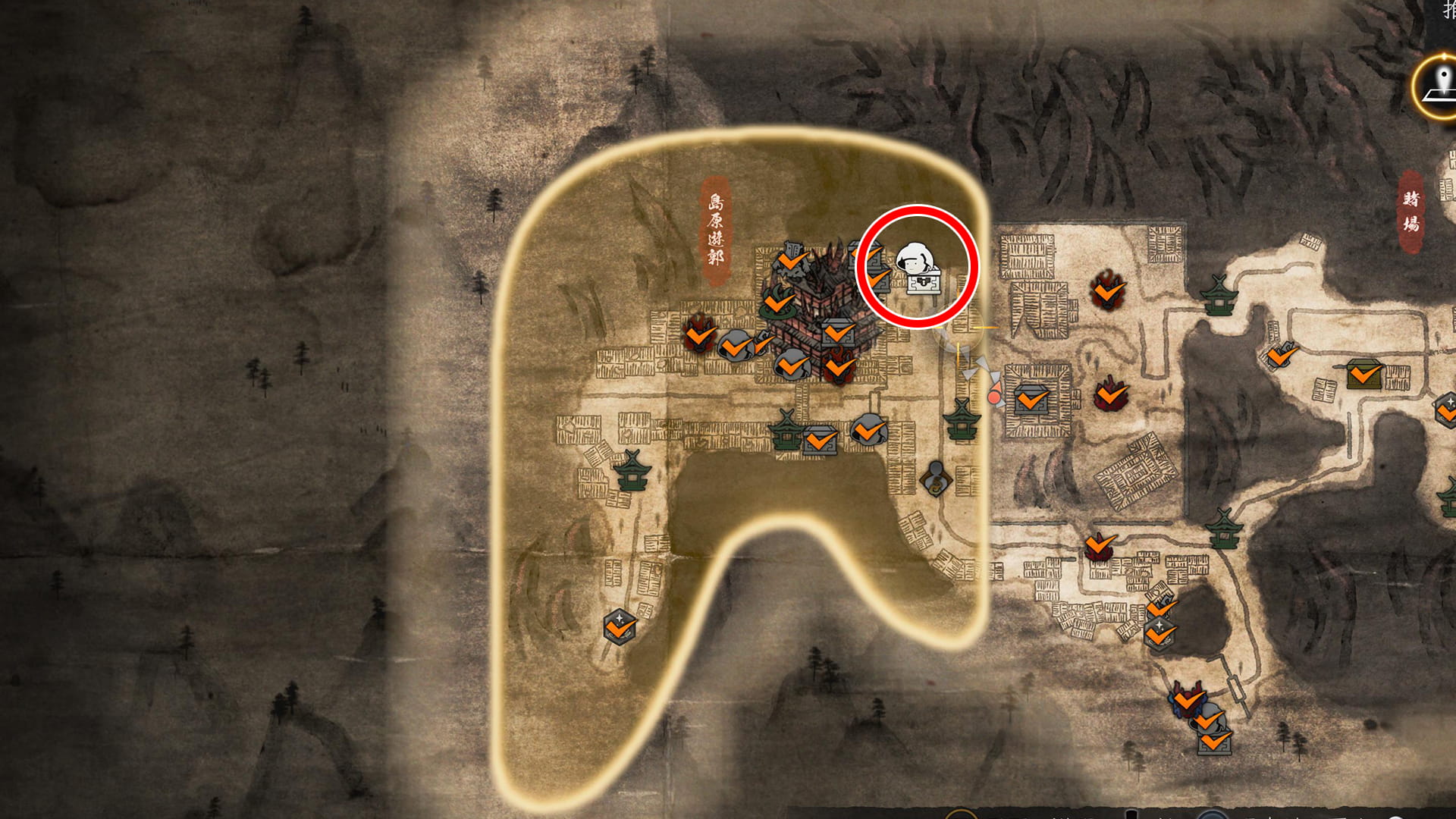島原エリア北東の木霊と宝箱がある場所へは、最初は行くことができないです。