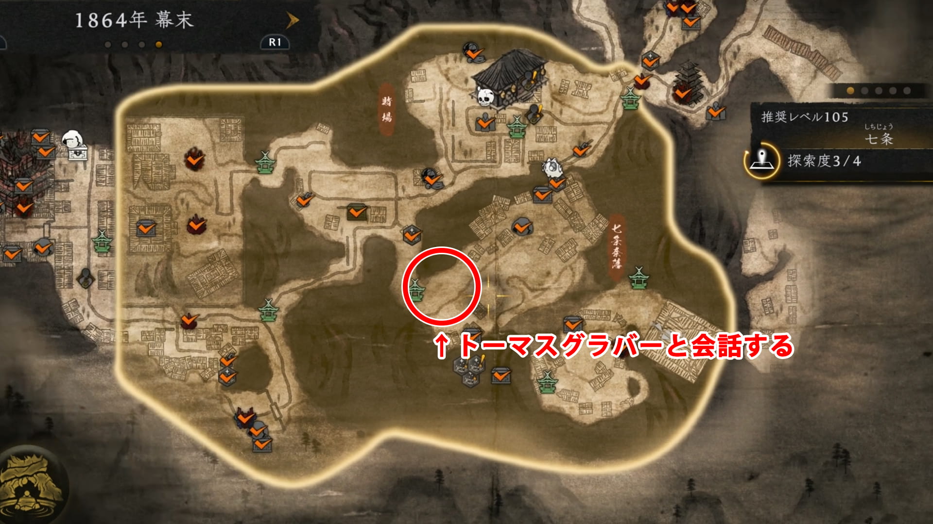 七条エリアの七条奈落の入口にある社の横辺りに、トーマスグラバーがいるので会話をします。
