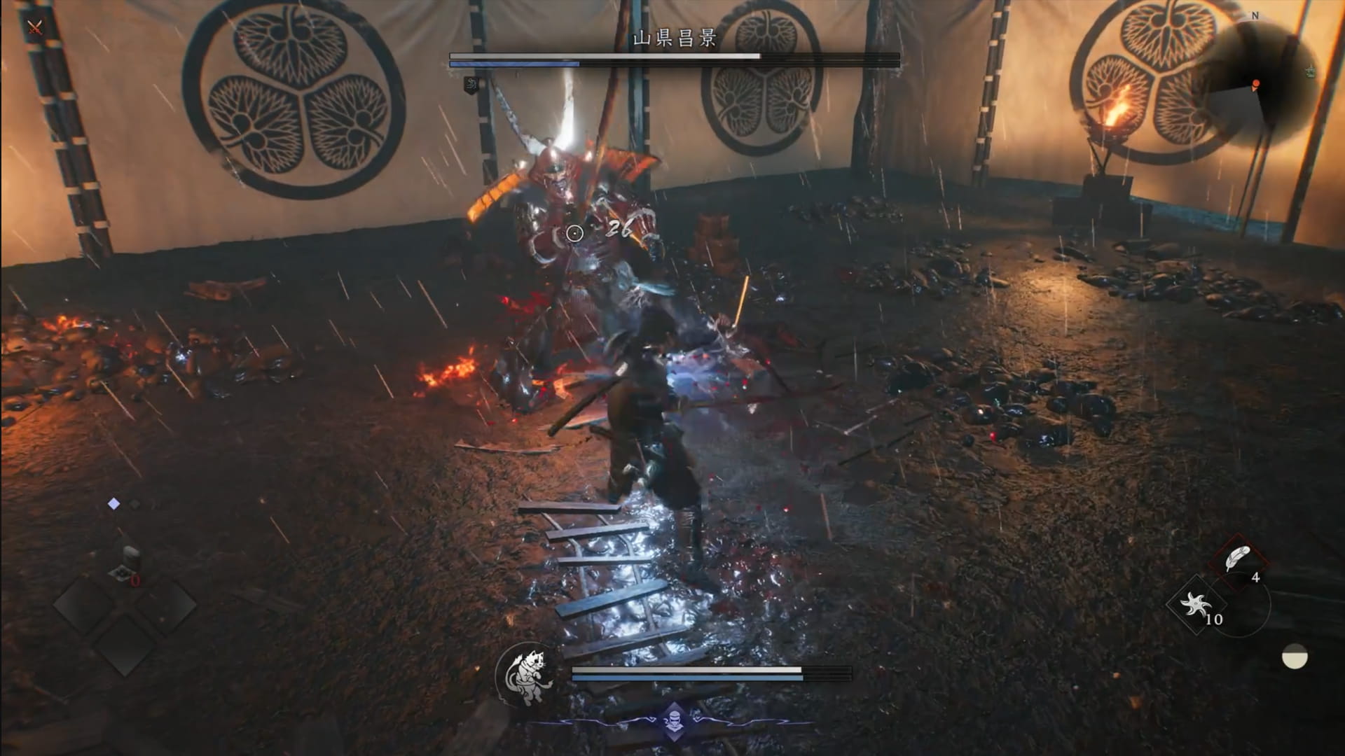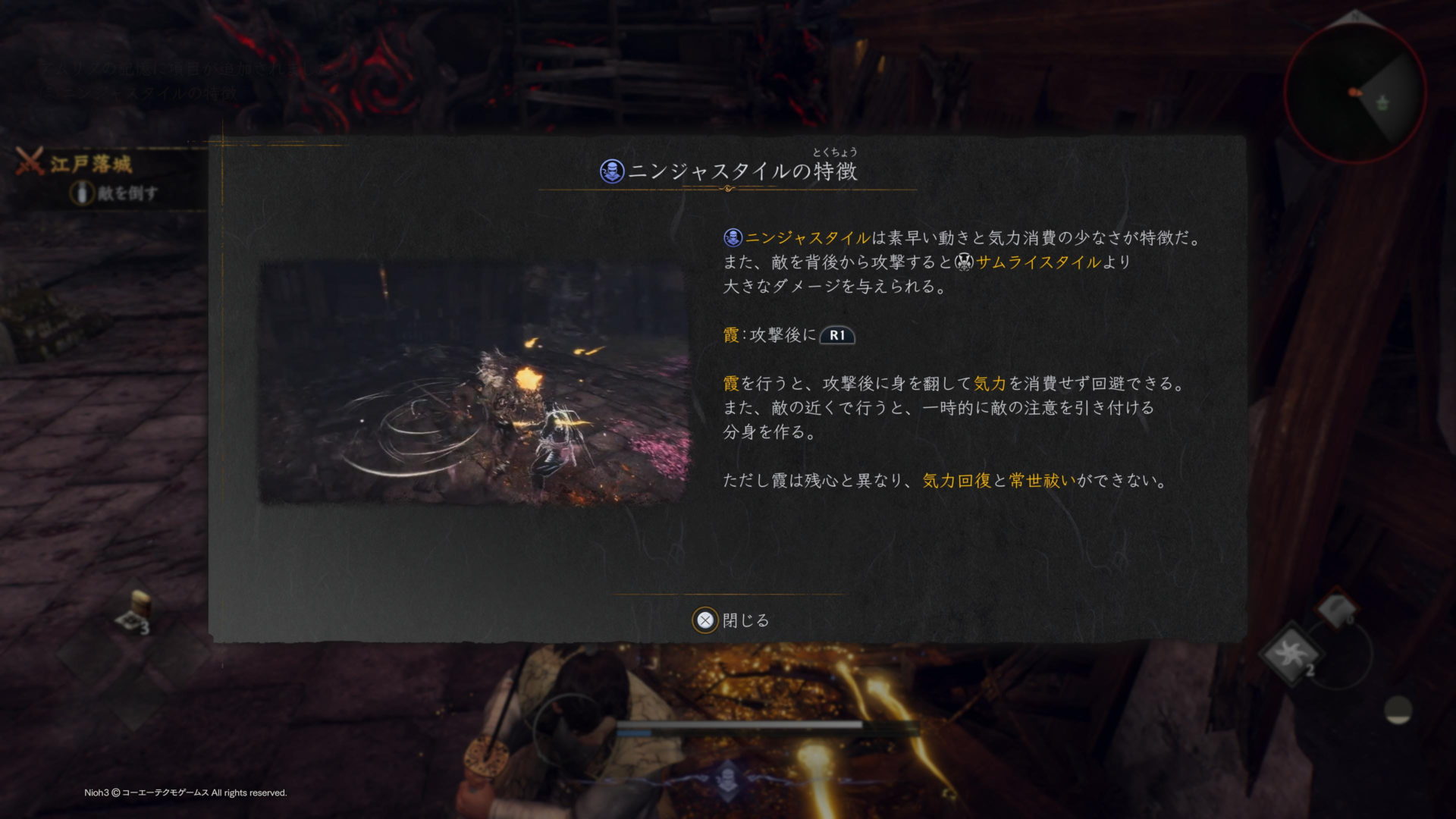 特に山県戦はサムライスタイルのパリィが使えないので、サクサク動かせるニンジャスタイルのヒット&アウェイ戦法はかなり有効になります。