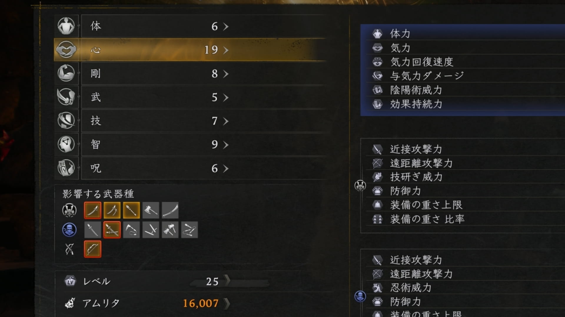ニンジャ二刀の攻撃力は、「心」に大きく補正がかかるので、これに全振りに近いくらいでいいと思います。