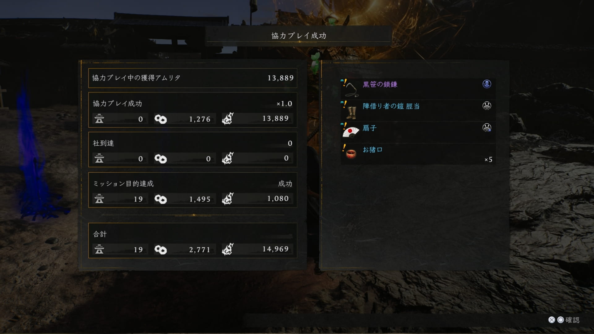 ちなみに2つめのミッションのアムリタは、15000ほどもらえます(ボス戦のみの場合)。