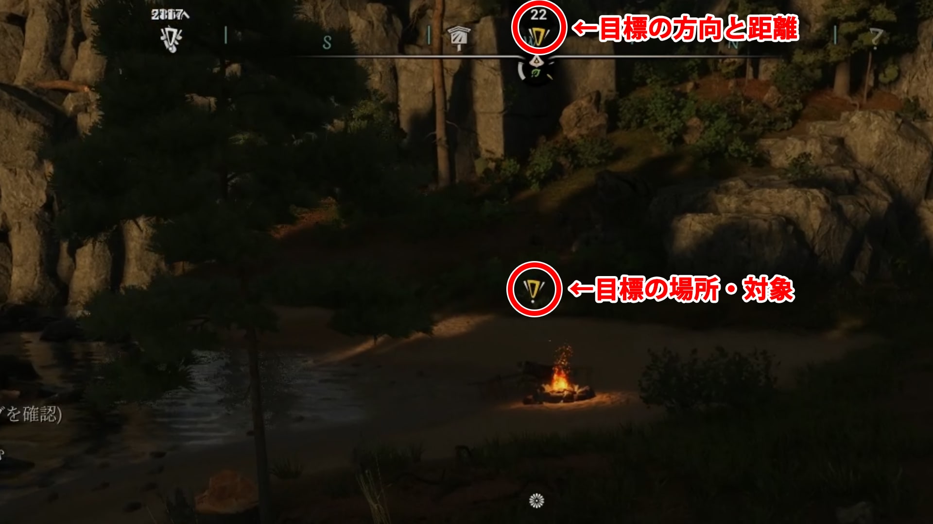 進行したいクエストから「クエストの追跡(□ボタン)」をすると、目標までの方向と距離が分かるようになるので、これに従って進めて行くと便利です。