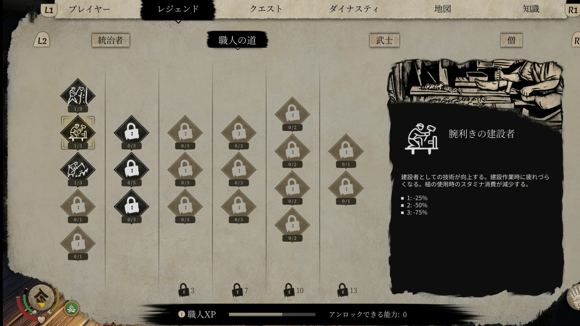「職人の道」タブの能力を解放できるので、お好みの能力を解放しましょう。