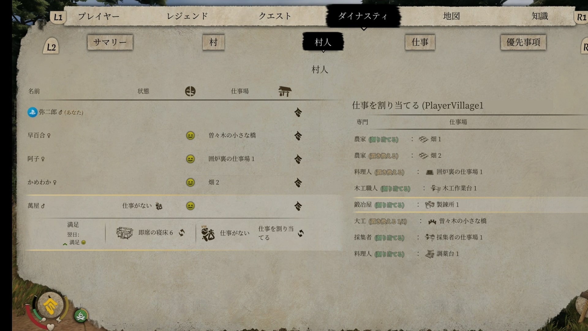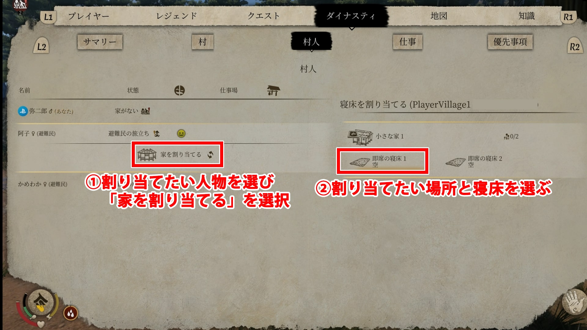 メニュー画面の「ダイナスティ」タブから「村人」タブを選択し、阿子を任意の寝床に割り当てます。