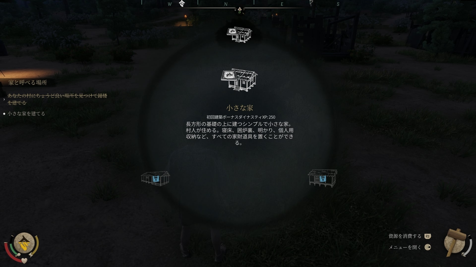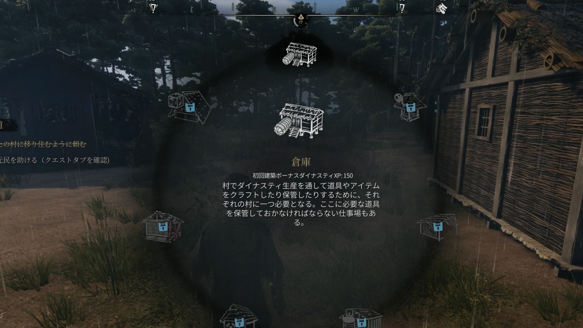 村民の食糧や自身の余分な素材やアイテムを保管するために、まずは倉庫を建築しておきます。