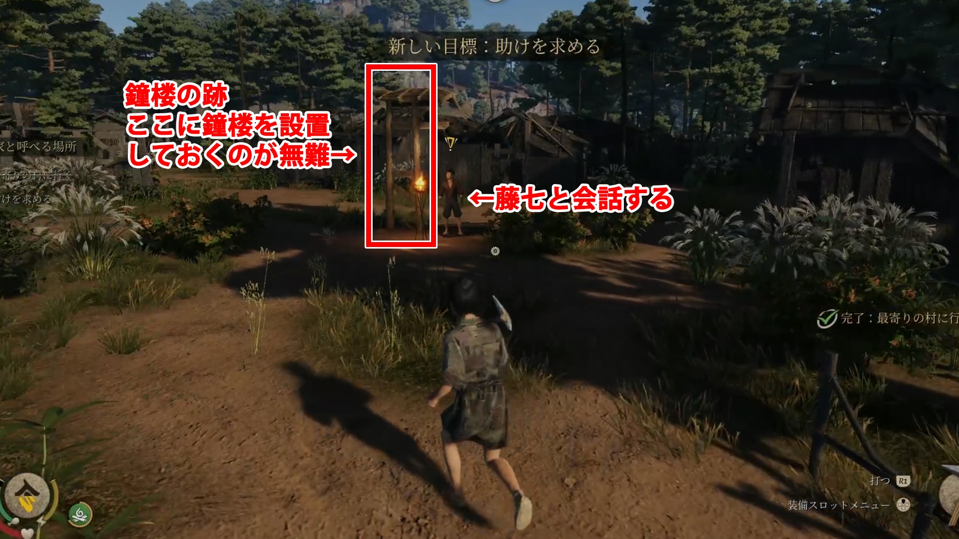 鐘楼を設置する場所はどこでもいいですが、藤七のすぐ横に焼け落ちた鐘楼があるので、それを解体して同じ場所に設置するのが無難かと。