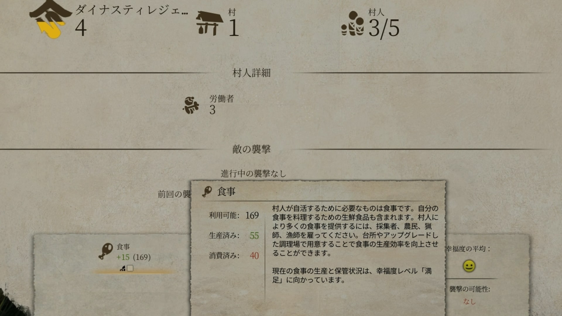 村民の食糧消費量より在庫・生産する食糧が多くないと、幸福度が下がっていきます。