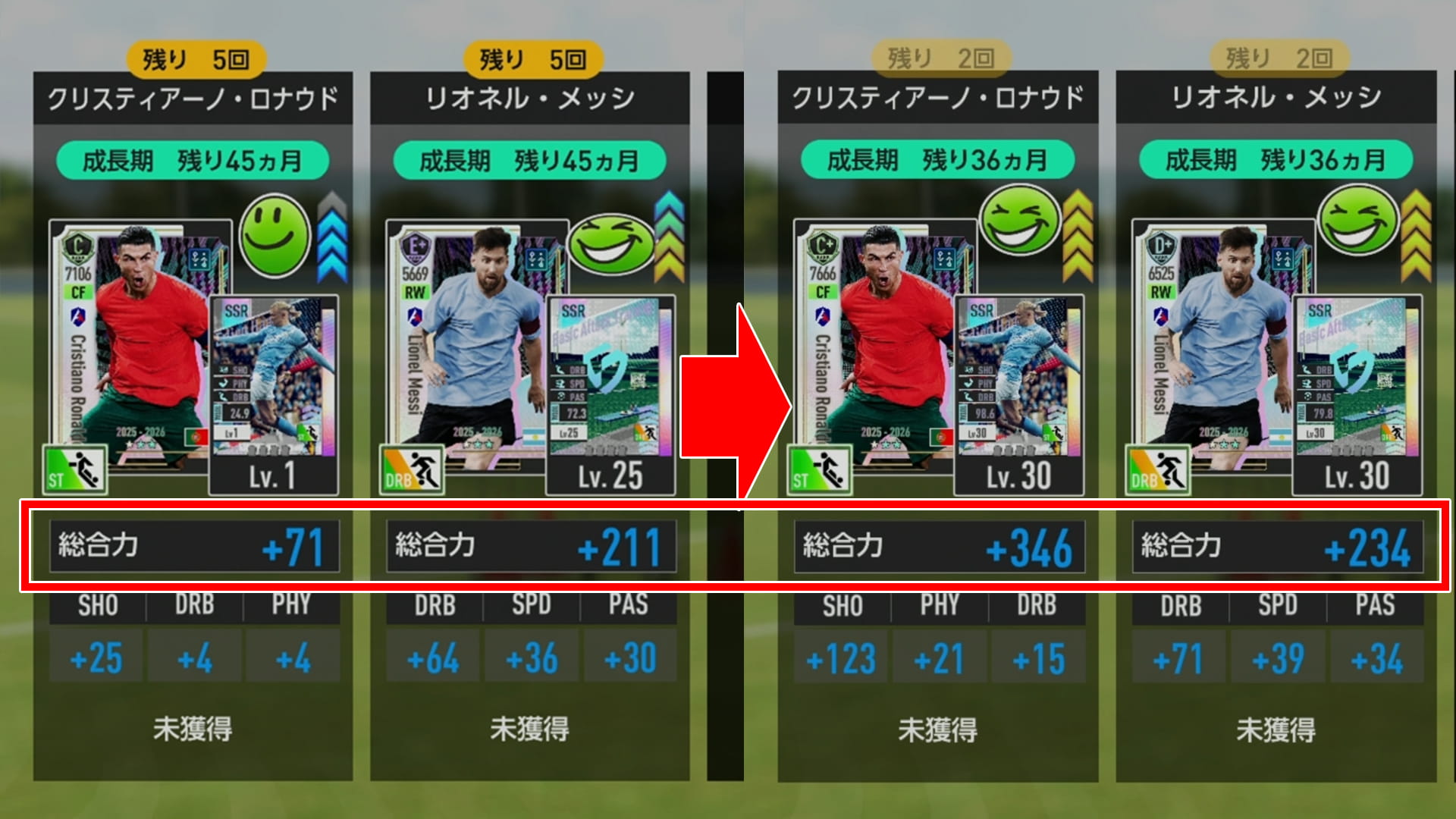 これによってレベル上限を引き上げることが可能になり、選手をより強化することができます(1回の限界突破ごとにレベル5ずつ上限解放、最大4回まで可能)。